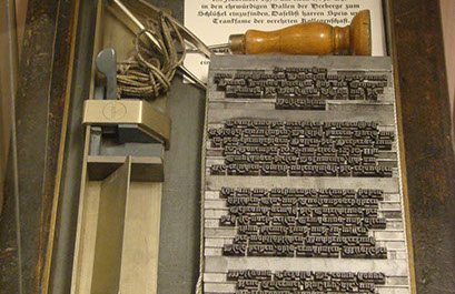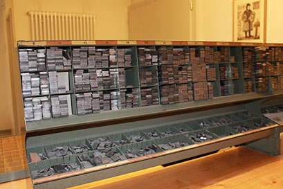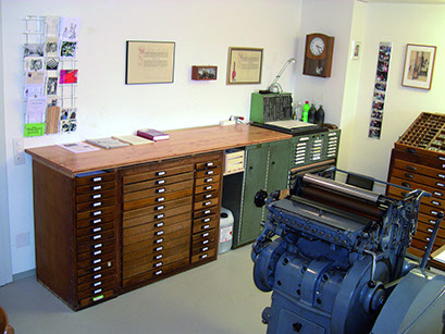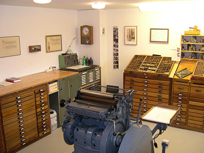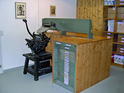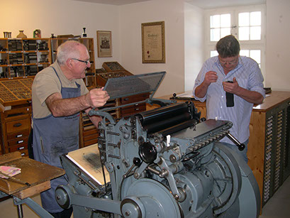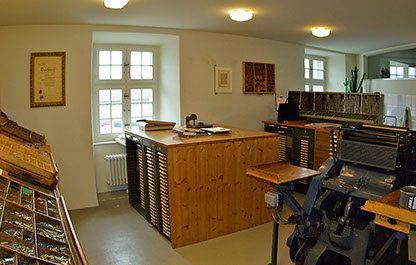 heute In der Druckwerkstatt wird nach der Tradition Gutenbergs aus Holzsetzkästen gesetzt und auf dem Handtiegel oder der Abziehpresse gedruckt. – Wir begrüssen gerne Gesellschaften für Führungen – aber auch kleinere Gruppen oder Einzelpersonen –, um ihnen die Techniken des Bleisatzes und des Buchdrucks zu vermitteln und auf Wunsch kann man auch selbstständig in der Werkstatt arbeiten.