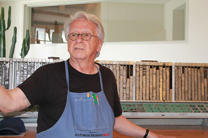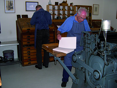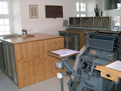 heute In der Druckwerkstatt wird nach der Tradition Gutenbergs aus Holzsetzkästen gesetzt und auf dem Handtiegel oder der Abziehpresse gedruckt. – Wir begrüssen gerne Gesellschaften für Führungen – aber auch kleinere Gruppen oder Einzelpersonen –, um ihnen die Techniken des Bleisatzes und des Buchdrucks zu vermitteln und auf Wunsch kann man auch selbstständig in der Werkstatt arbeiten.